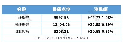 过去一周(11月3日—11月7日),A股三大指数全线上涨。截至11月7日收盘,沪指报3997.56点,周涨1.08%;深成指报13404.06点,周涨0.19%;创业板指报3208.21点,周涨0.65%。