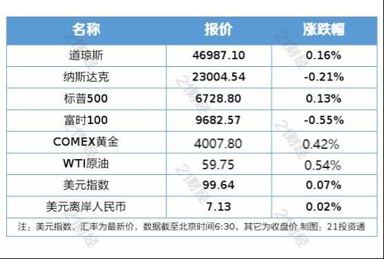 纽约股市三大股指11月7日涨跌不一。截至11月7日收盘,道琼斯工业平均指数比前一交易日上涨74.80点,收于46987.10点,涨幅为0.16%;标准普尔500种股票指数上涨8.48点,收于6728.8点,涨幅为0.13%;纳斯达克综合指数下跌49.46点,收于23004.54点,跌幅为0.21%。