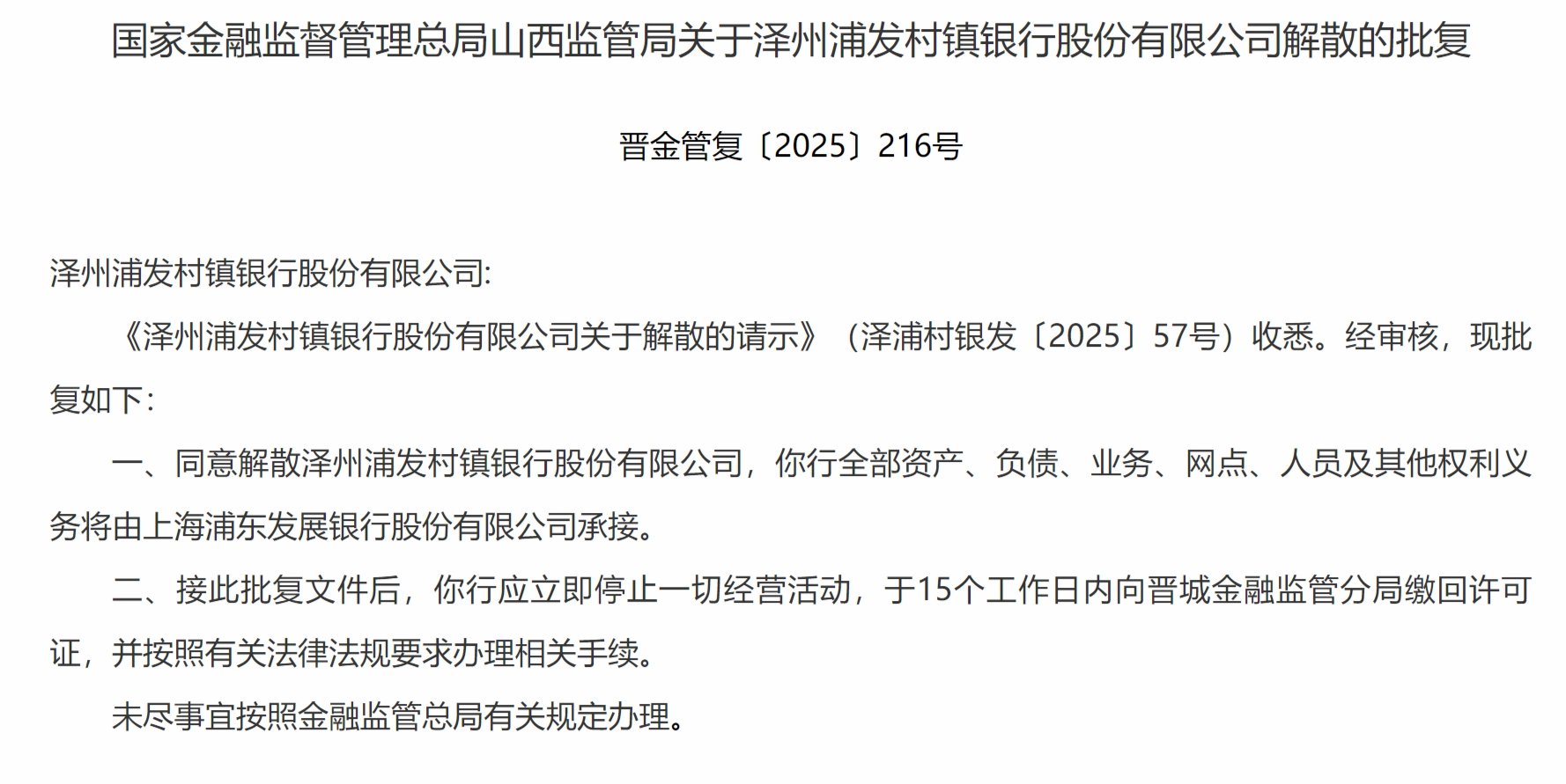 12月2日,国家金融监督管理总局山西监管局发布关于泽州浦发村镇银行股份有限公司解散的批复,同意解散泽州浦发村镇银行股份有限公司,该行全部资产、负债、业务、网点、人员及其他权利义务将由上海浦东发展银行股份有限公司承接。