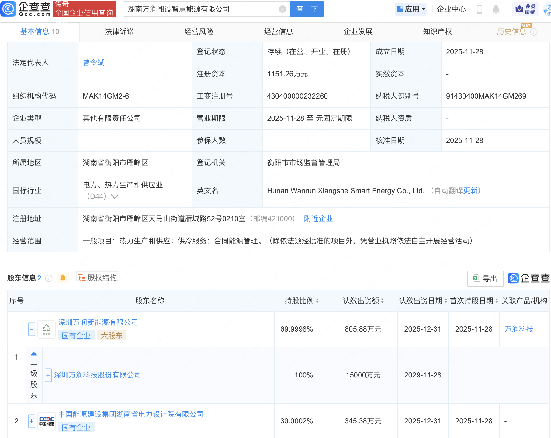 近日,湖南万润湘设智慧能源有限公司成立,经营范围包含:热力生产和供应;供冷服务;合同能源管理。企查查股权穿透显示,该公司由万润科技(002654)全资子公司深圳万润新能源有限公司、中国能源建设集团湖南省电力设计院有限公司共同持股。